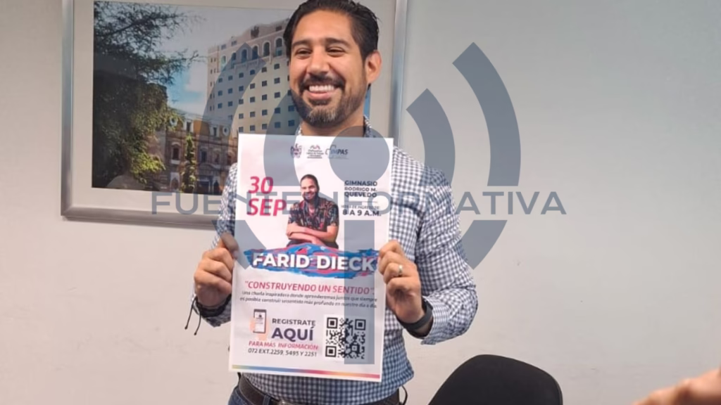 Este especialista viene a hablar principalmente sobre salud mental y a abordar el tema de cambiar los sentidos de la vida. Farid Dieck es un experto en darle un sentido psicológico a películas y relatos, y su presencia se considera un buen momento para cerrar el mes de la salud mental y la prevención del suicidio.