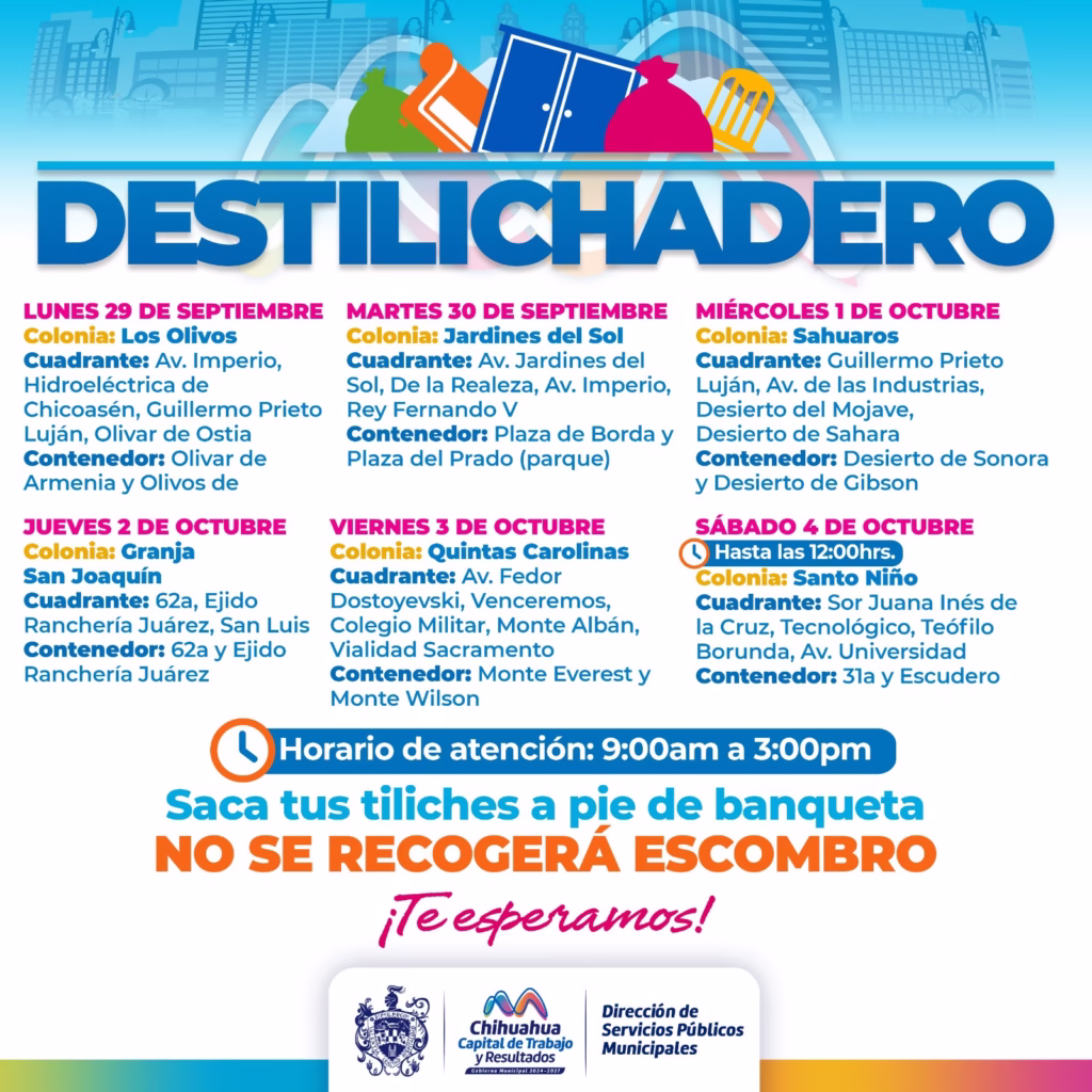 H. Ciudad de Chihuahua, Chih., a 27 de septiembre de 2025.- Para evitar acumulaciones de basura de grandes dimensiones en las viviendas, que podrían generar plagas o problemas de salud, el Gobierno Municipal, a través de la Dirección de Servicios Públicos Municipales, informa el calendario del programa Destilichadero, que se realizará del 29 de septiembre al 4 de octubre en seis colonias de la Capital.