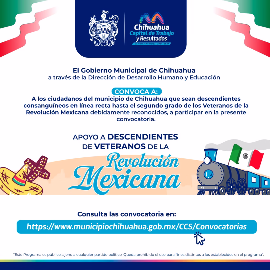 H. Ciudad de Chihuahua, Chih., a 30 de septiembre de 2025.- El Gobierno Municipal, a través de la Dirección de Desarrollo Humano y Educación, invita a ciudadanos de la ciudad que sean descendientes directos (hasta segundo grado) de veteranos reconocidos de la Revolución Mexicana, a participar en la convocatoria del programa “Apoyo a Descendientes de Veteranos de la Revolución Mexicana”.
