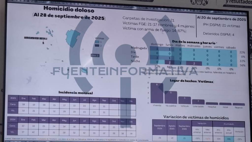 Chihuahua, Chih.- En su informe de septiembre, el comisario de la Dirección de Seguridad Pública Municipal (DSPM)l, Julio Cesar Salas González informó que la tendencia de homicidios en la ciudad se mantiene a la baja, resultado -dijo- de la coordinación entre corporaciones y de los operativos focalizados en la zona norte de la ciudad.