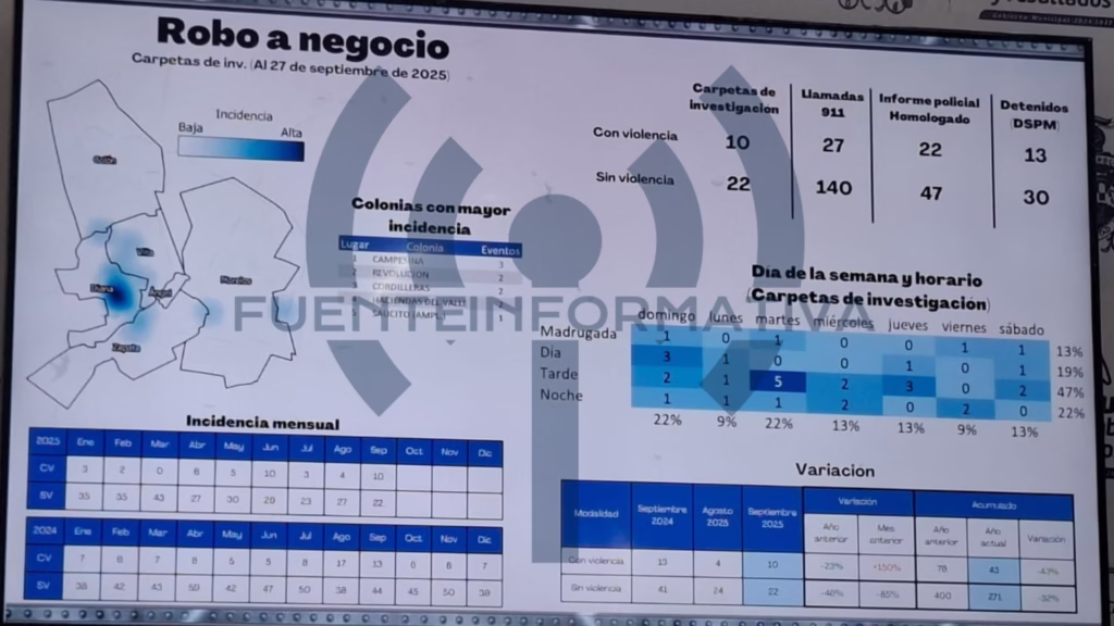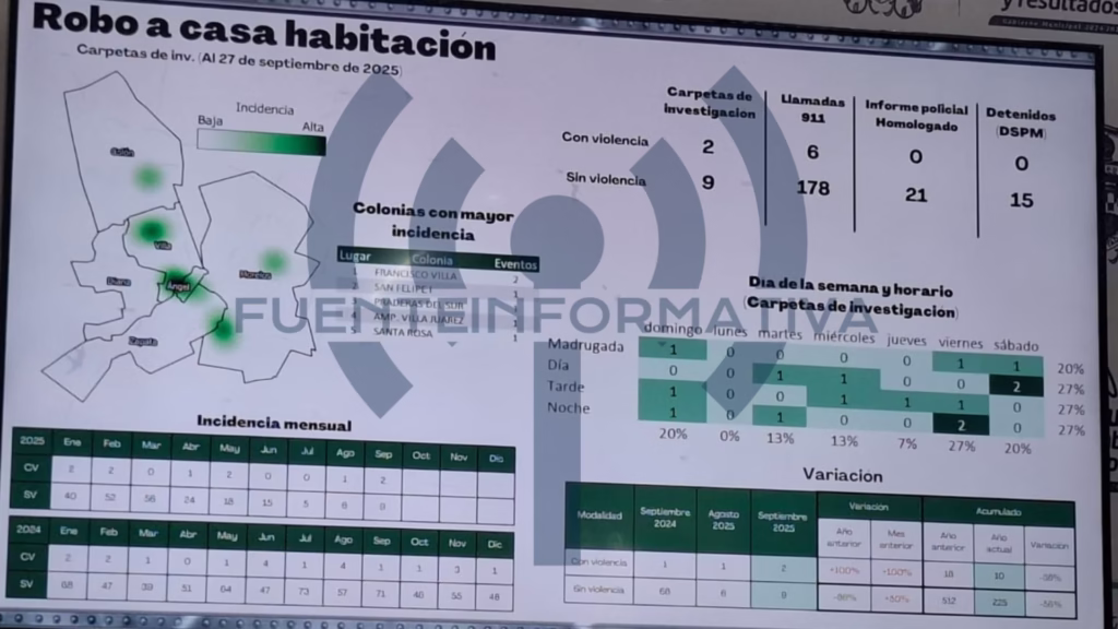 En cuanto a tema de robos, detalló que los robos a casa habitación registraron únicamente dos eventos con violencia y nueve sin violencia en el mes de septiembre, lo que representa un acumulado de 225 viviendas menos afectadas en comparación con el periodo anterior.