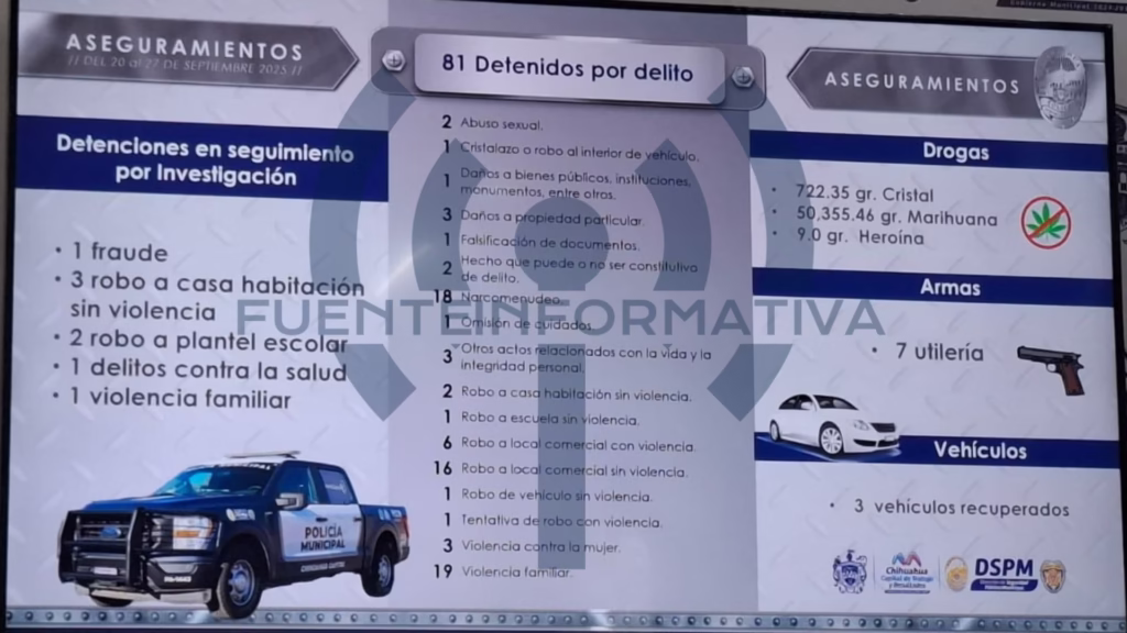 El comisario también informó sobre 18 detenciones por narcomenudeo, 16 por distintos robos y 19 por violencia familiar, resaltando que en este último delito “no hay mediación, es detención y puesta a disposición del área de la Fiscalía”