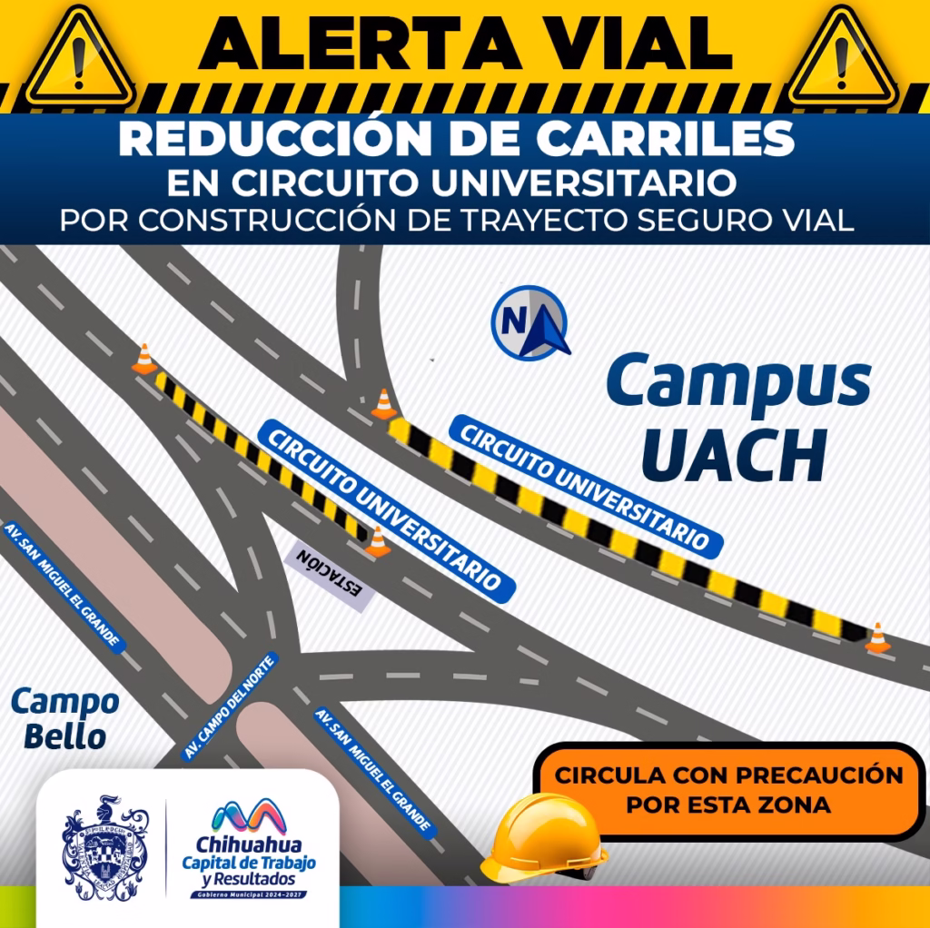 H. Ciudad de Chihuahua, Chih., a 3 de octubre de 2025.-El Gobierno Municipal a través de la Dirección de Obras Públicas, emite una alerta vial por la reducción de carriles en el Circuito Universitario a la altura de la Facultad de Ingeniera de la UACH, en el sentido sur-norte debido a los trabajos de demolición de asfalto para la construcción de un paso peatonal pompeyano, como parte de la obra denominada Trayecto Vial Seguro.