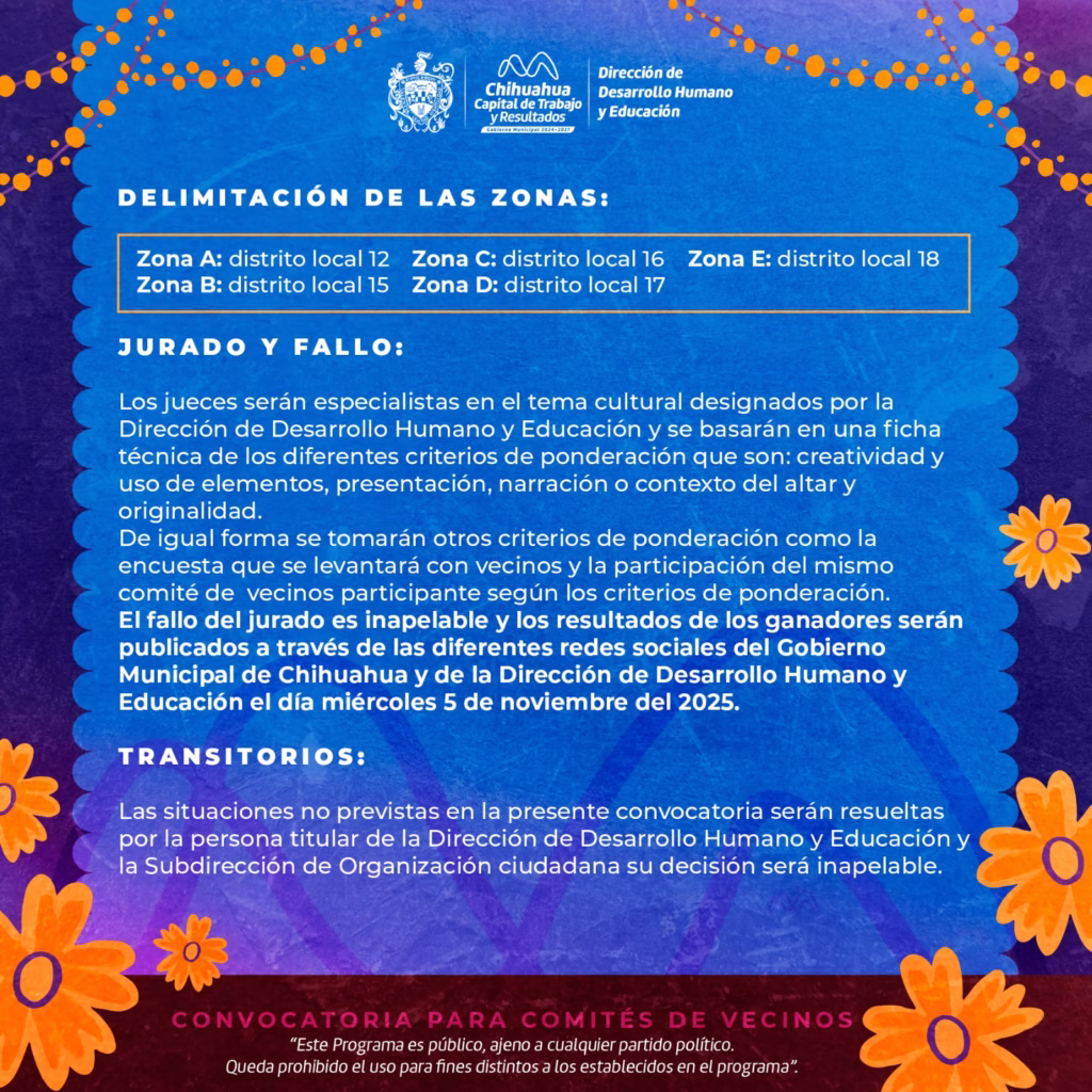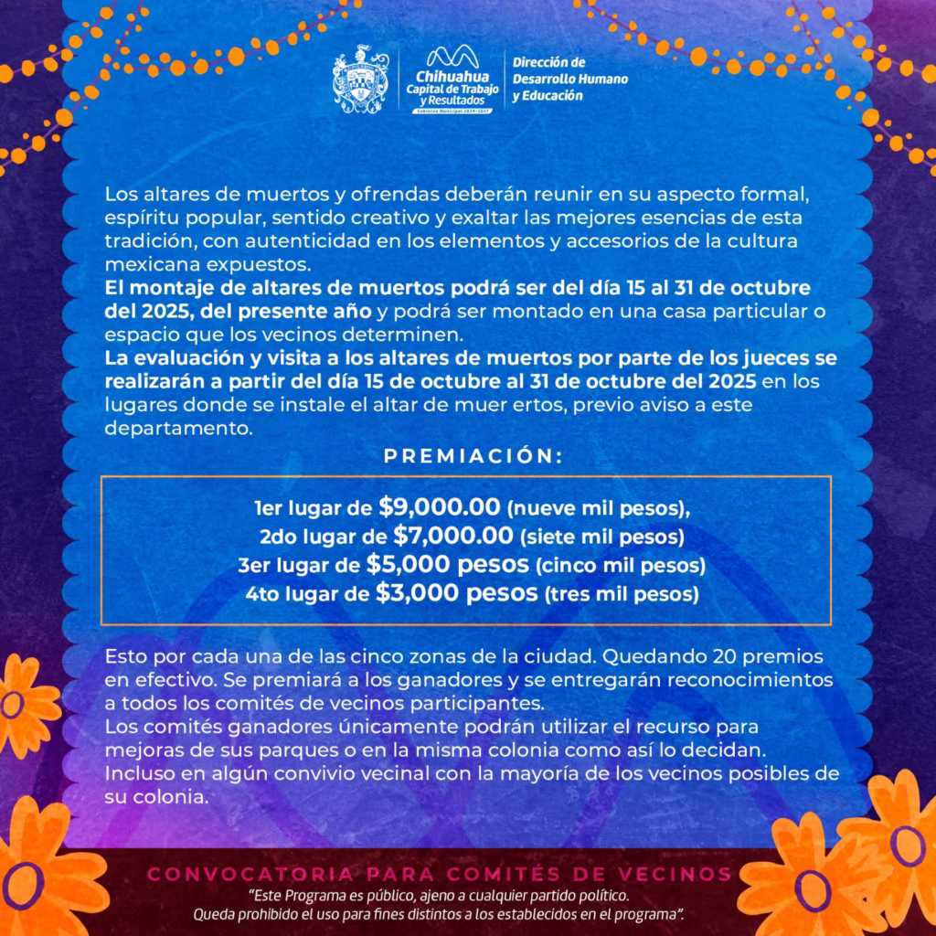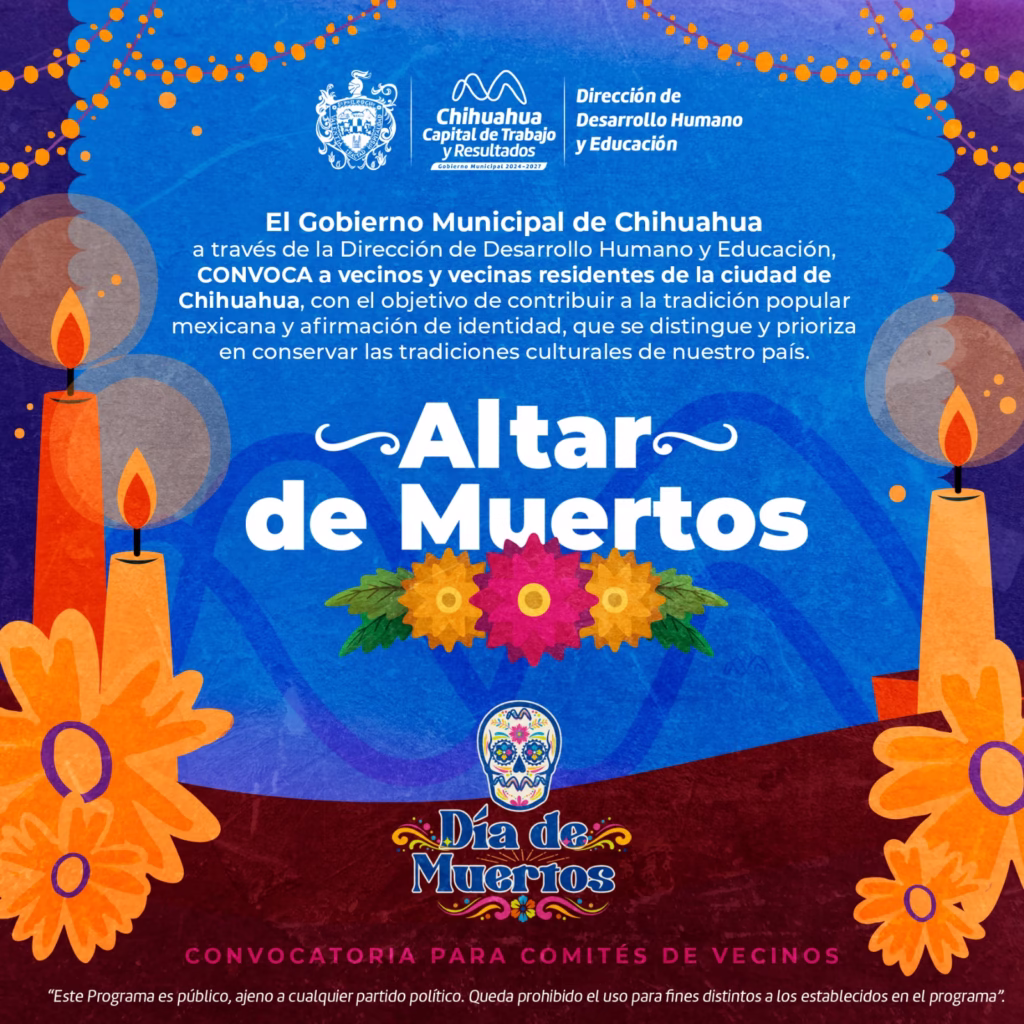 H. Ciudad de Chihuahua, Chih., a 6 de octubre de 2025.– El Gobierno Municipal de Chihuahua, a través de la Dirección de Desarrollo Humano y Educación, invita a los comités de vecinos del municipio a participar en el Concurso de Altar de Muertos 2025, con el objetivo de preservar y fortalecer las tradiciones culturales mexicanas.