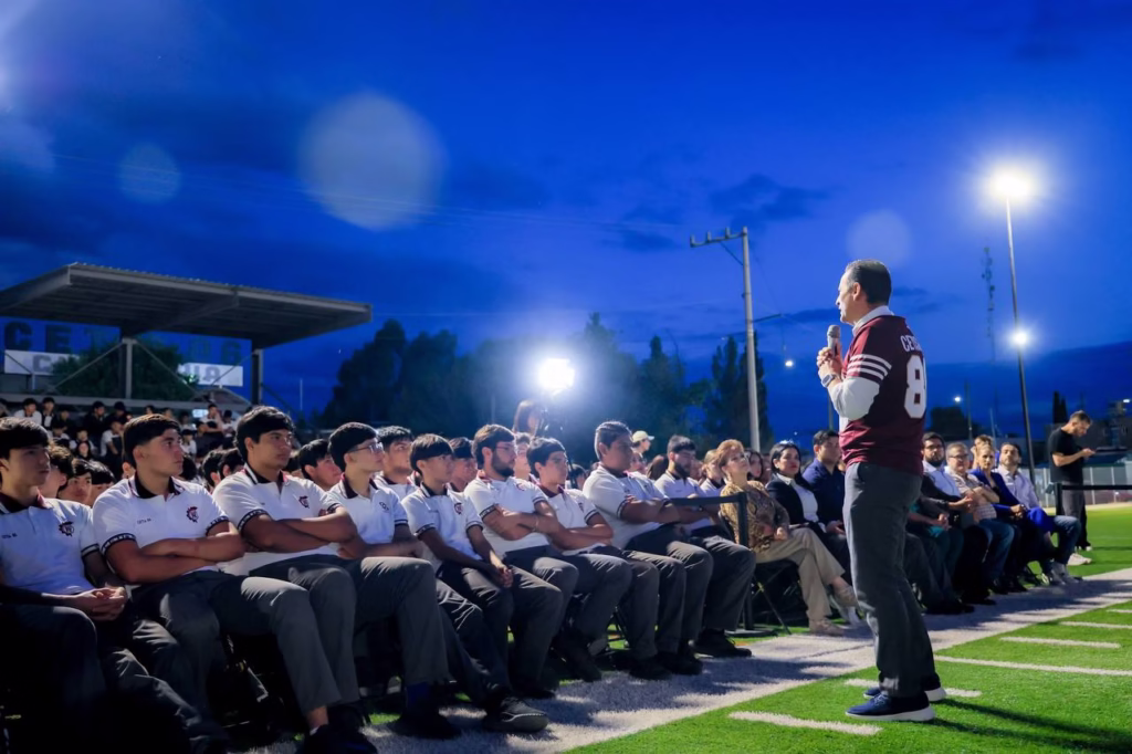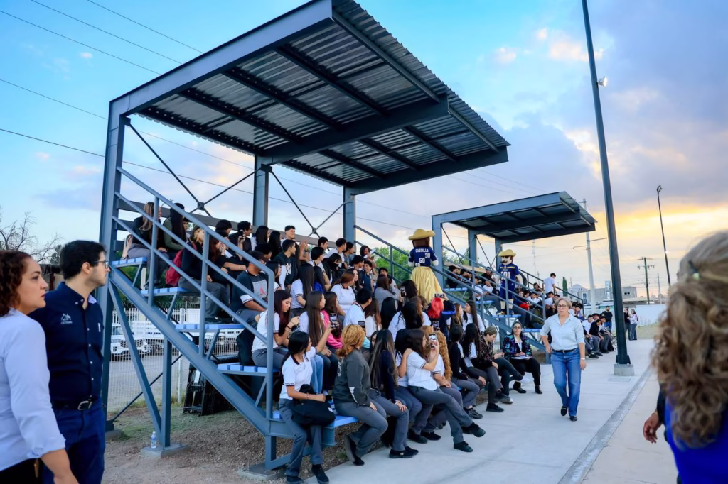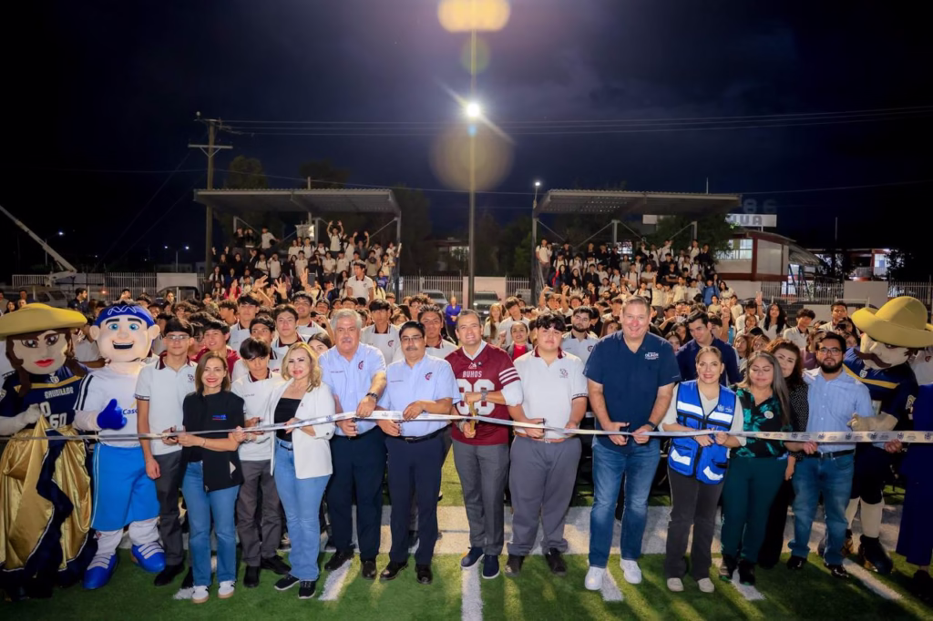H. Ciudad de Chihuahua, Chih., a 9 de octubre de 2025.– El alcalde de Chihuahua, Marco Bonilla, hizo entrega de las graderías y luminarias instaladas en la cancha de futbol americano del Centro de Estudios Tecnológicos Industrial y de Servicios número 86 (CETIS), un proyecto impulsado por la propia comunidad estudiantil para que ganara la consulta del Presupuesto Participativo 2025, con más de 3 mil votos a favor.