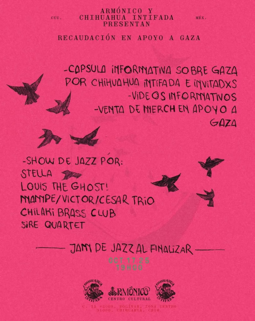 Chihuahua, Chih.- Con el objetivo de recaudar fondos para apoyar a familias palestinas afectadas en Gaza, el colectivo Chihuahua Intifada, en colaboración con el Centro Cultural Armónico y artistas locales, presentará este viernes 17 de octubre el evento “Jazz por Jam en apoyo a Gaza”, una jornada musical y solidaria en el primer cuadro de la ciudad.
