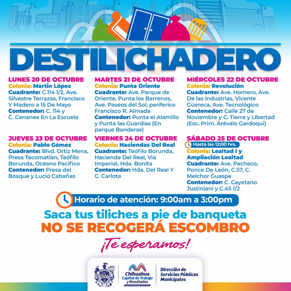 H. Ciudad de Chihuahua, Chih. A 18 de octubre de 2025.- Para evitar acumulaciones de basura de grandes dimensiones en las viviendas, que podría generar plagas o problemas de salud, el Gobierno Municipal, a través de la Dirección de Servicios Públicos Municipales, informa el calendario del programa Destilichadero, que se realizará 20 al 25 de octubre en siete colonias de la Capital.