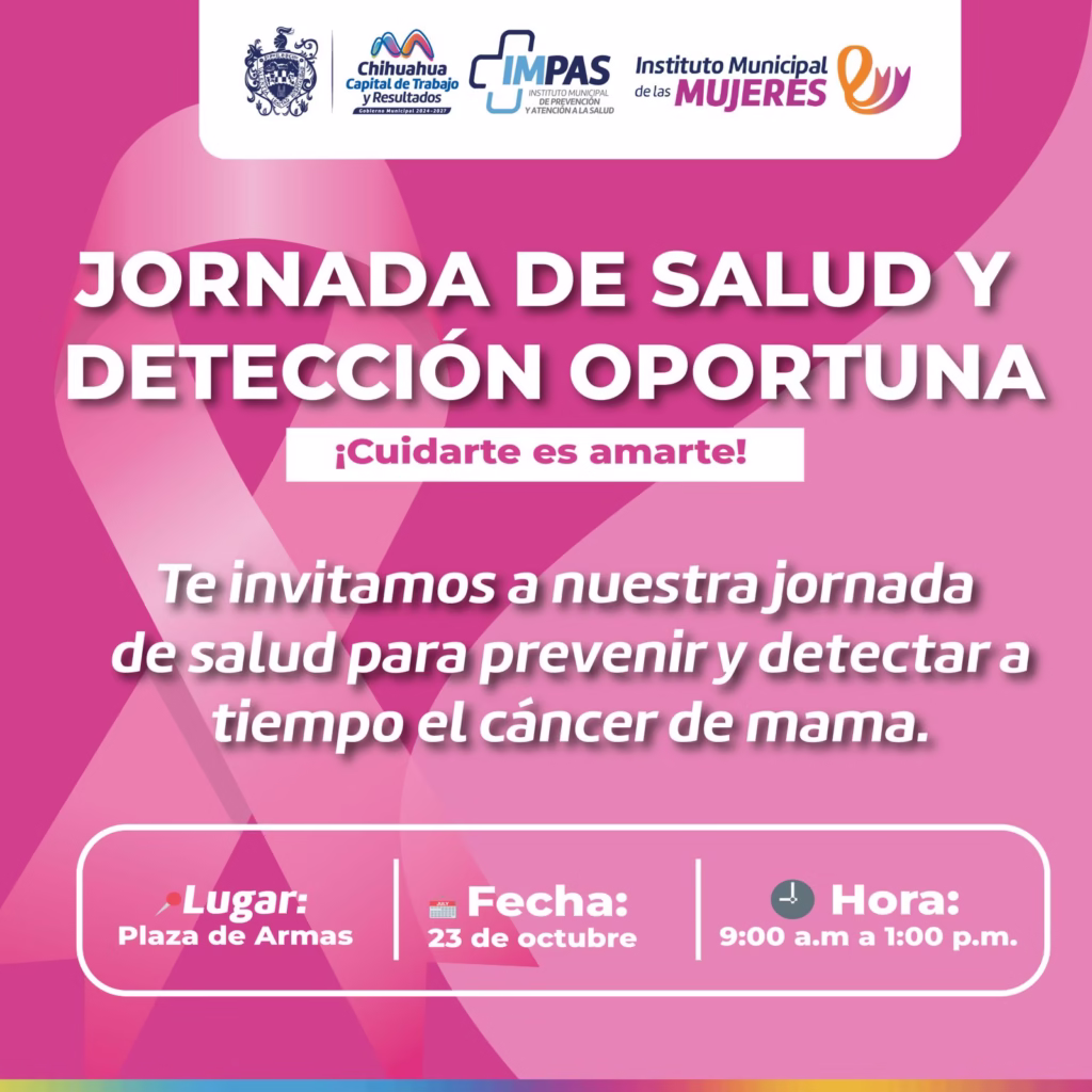 H. Ciudad de Chihuahua, Chih., a 21 de octubre del 2025.- El Gobierno Municipal, invita a la próxima Jornada de Salud y Detección Temprana del cáncer de mama, este 23 de octubre en Plaza de Armas de 9:00 am a 1:00 pm, abierta al público en general sin cita previa.