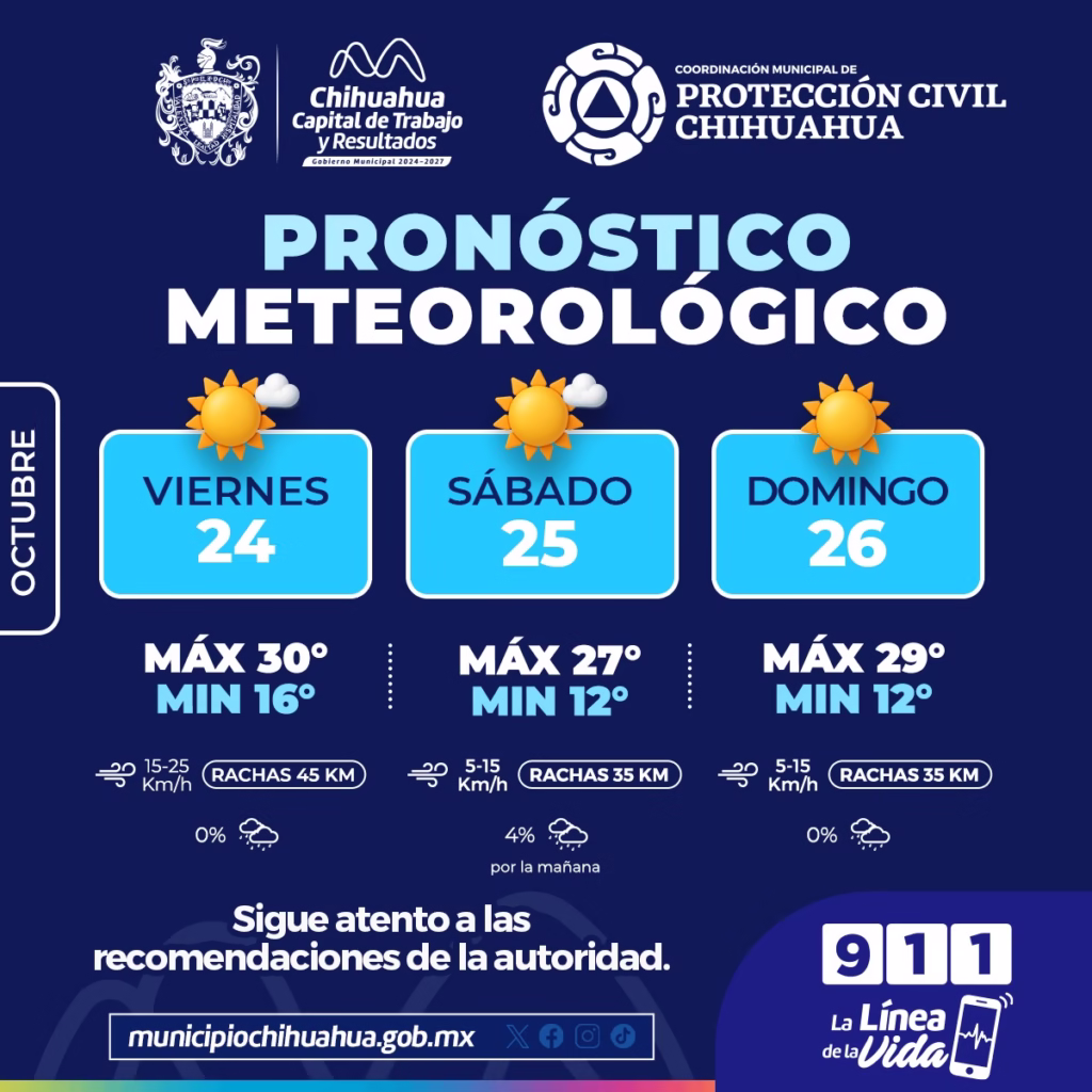 H. Ciudad de Chihuahua, Chih., a 24 de octubre de 2025.- El Gobierno Municipal de Chihuahua, a través de la Coordinación Municipal de Protección Civil, informa que para este fin de semana se esperan condiciones mayormente soleadas, vientos moderados y muy baja probabilidad de lluvia.