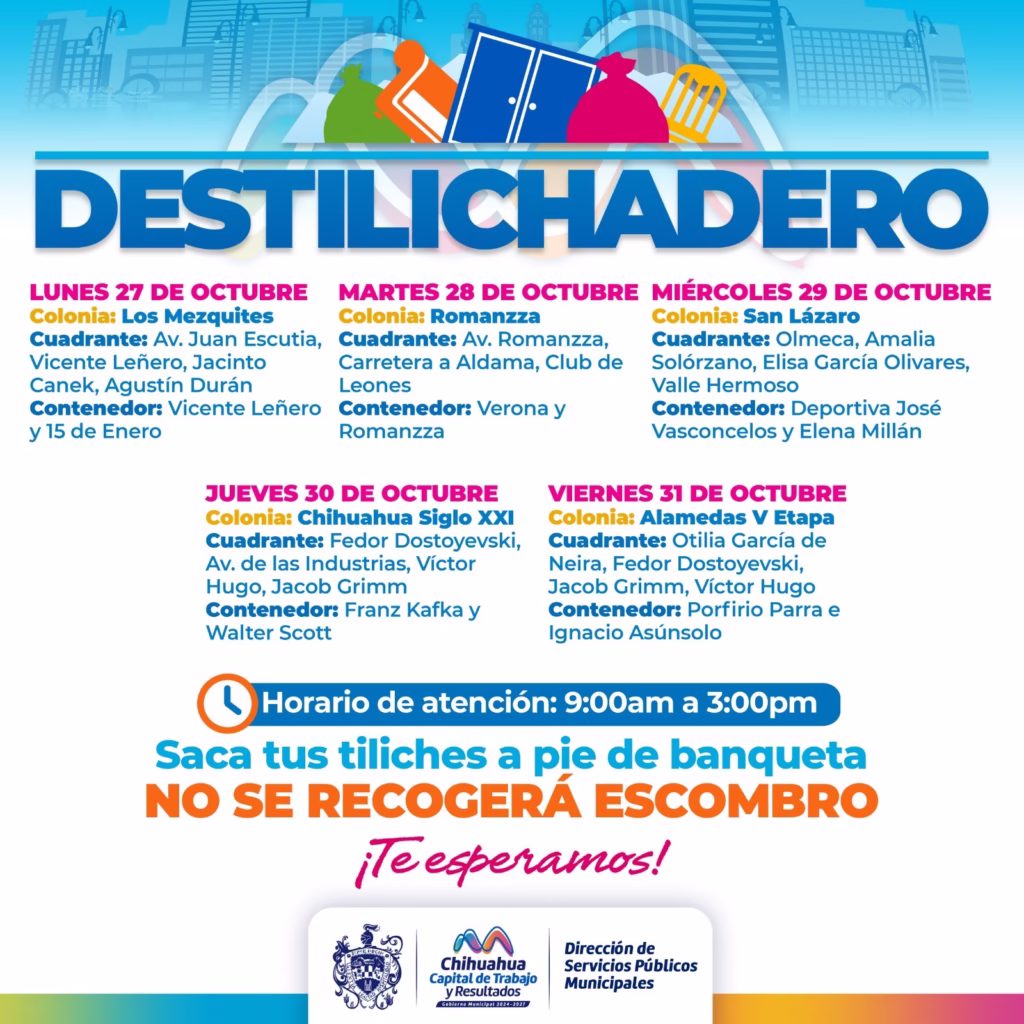 H. Ciudad de Chihuahua, Chih., a 25 de octubre de 2025.- Para evitar acumulaciones de basura de grandes dimensiones en las viviendas, que podría generar plagas o problemas de salud, el Gobierno Municipal, a través de la Dirección de Servicios Públicos Municipales, informa el calendario del programa Destilichadero, que se realizará 27 al 31 de octubre en cinco colonias de la Capital.