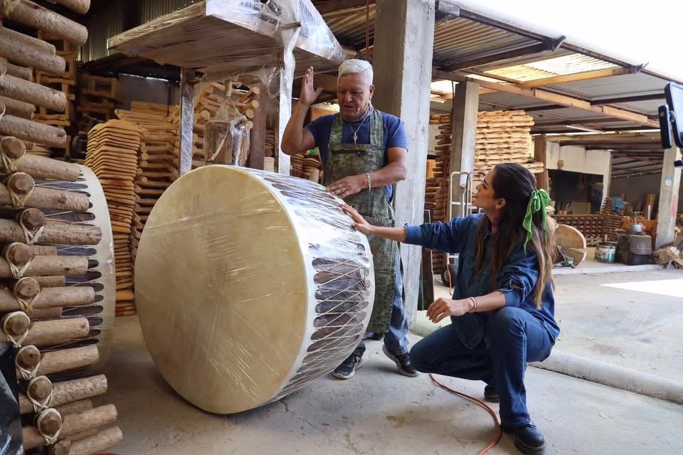 En su recorrido por la comunidad de Sisoguichi, municipio de Bocoyna, Andrea Chávez conoció el taller artesanal de tambores y bateas de la familia Vecino, encabezado por don Juan, quien ha dedicado más de 50 años a preservar una tradición que late con el alma de la sierra.