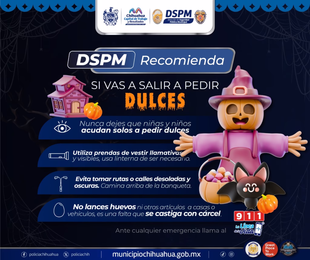 H. Ciudad de Chihuahua, Chih., a 30 de octubre de 2025.- La Dirección de Seguridad Pública Municipal, reforzará los rondines de vigilancia por Halloween este 31 de octubre, donde niñas y niños salen disfrazados por las calles a pedir dulces.