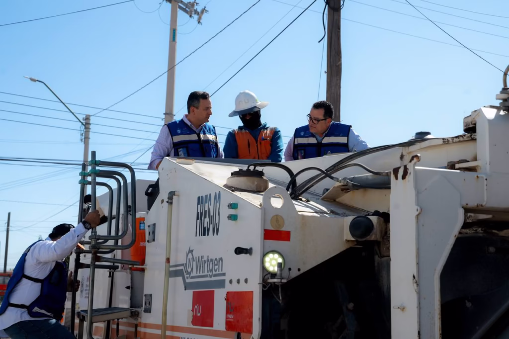 H. Ciudad de Chihuahua, Chih., a 31 de octubre de 2025.- La tarde de ayer jueves, el alcalde Marco Bonilla y el gerente del Consejo de Urbanización Municipal (CUM), Oscar Derma, recorrieron la avenida Miguel Barragán, donde se trabaja en el frezado o raspado de la cinta asfáltica para una vez concluida esta etapa iniciar con la colocación del asfalto.