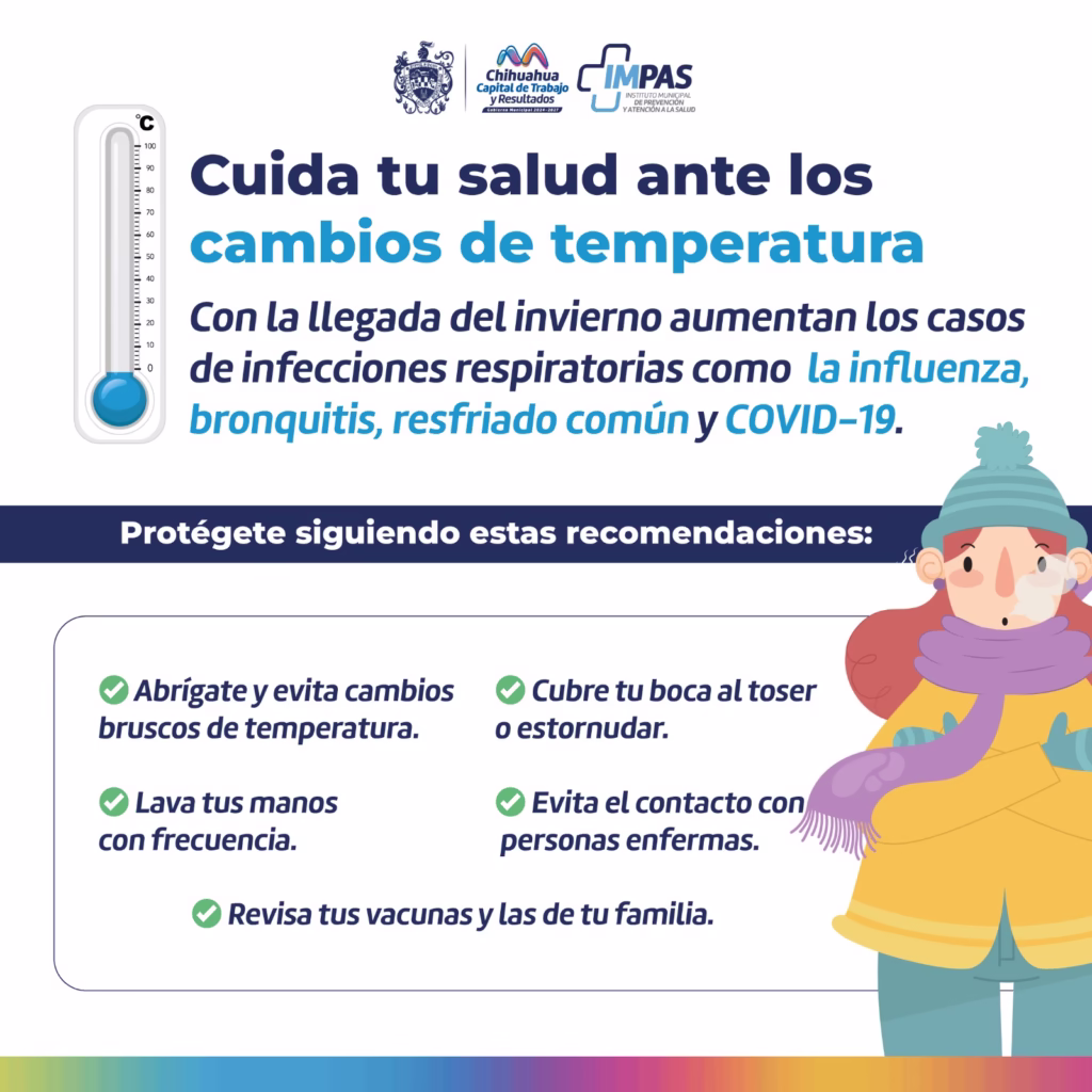H. Ciudad de Chihuahua, Chih., a 6 de noviembre de 2025.-El Gobierno Municipal a través del Instituto Municipal de Prevención y Atención a la Salud (IMPAS), invita a la ciudadanía a reforzar las medidas preventivas ante el incremento de infecciones respiratorias agudas que afectan la nariz la garganta y los pulmones en la temporada invernal.