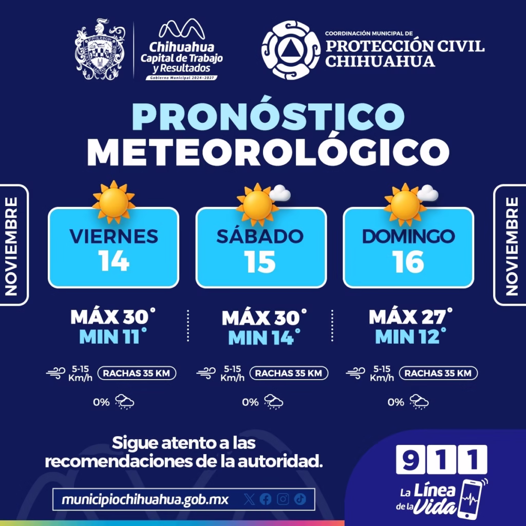 H. Ciudad de Chihuahua, Chih., a 14 de noviembre de 2025.- El Gobierno Municipal de Chihuahua, a través de la Coordinación Municipal de Protección Civil, informa que para este fin de semana se pronostican condiciones estables, con cielo despejado a mayormente soleado, sin probabilidad de lluvias en la Capital.