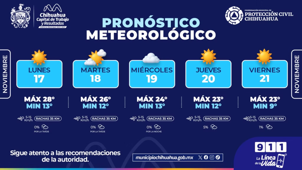 H. Ciudad de Chihuahua, Chih., a 17 de noviembre de 2025.- El Gobierno Municipal de Chihuahua, a través de la Coordinación Municipal de Protección Civil, informa que durante esta semana se prevén mañanas frescas, así como tardes un poco más calurosas, por lo que exhortan a no bajar la guardia y cuidarse de los cambios de temperatura para evitar enfermedades.