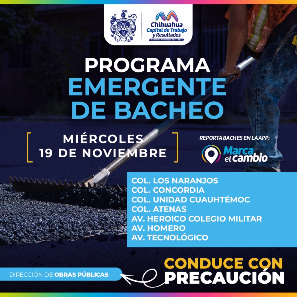 H. Ciudad de Chihuahua, Chih., a 19 de noviembre del 2025.- El Gobierno Municipal, a través de la Dirección de Obras Públicas, realizará trabajos de bacheo este miércoles 19 de noviembre, mediante el programa emergente en calles de las colonias: Los Naranjos, Concordia, Unidad Cuauhtémoc, Atenas, así como en las avenidas Heroico Colegio Militar, Homero y Tecnológico. Para seguridad de conductores, se exhorta a tomar precauciones, por las labores con múltiples cuadrillas que se realizarán por la mañana.