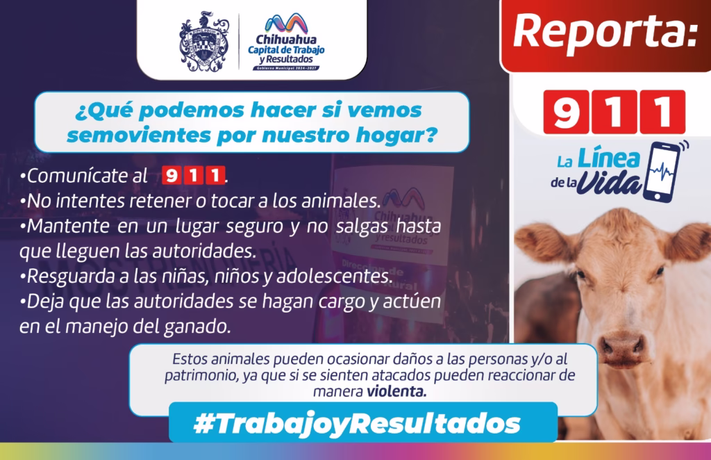 Si te encuentras con cualquier de ganado mayor o menor comunícate al 9-1-1; es importante no retener o tocar a los animales debido a que se pueden poner agresivos y te pueden lastimar o causar algún accidente.