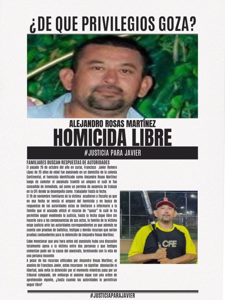 Chihuahua, Chih.- A la redacción de FuenteInfo llegó una denuncia ciudadana presentada pidiendo justicia para Francisco Javier Romero López de 20 años, quien fue privado de la vida el pasado 26 de octubre afuera de un domicilio situado en la calle Américas #3719, durante una fiesta. Según lo señalado, el presunto responsable, identificado como Alejandro Rosas Martinez, habría tramitado un amparo inmediatamente después del hecho, mismo que presuntamente le fue concebido, además de gestionar un permiso de ausencia en la Comisión Federal de Electricidad (CFE), donde continúa registrado como trabajador.
