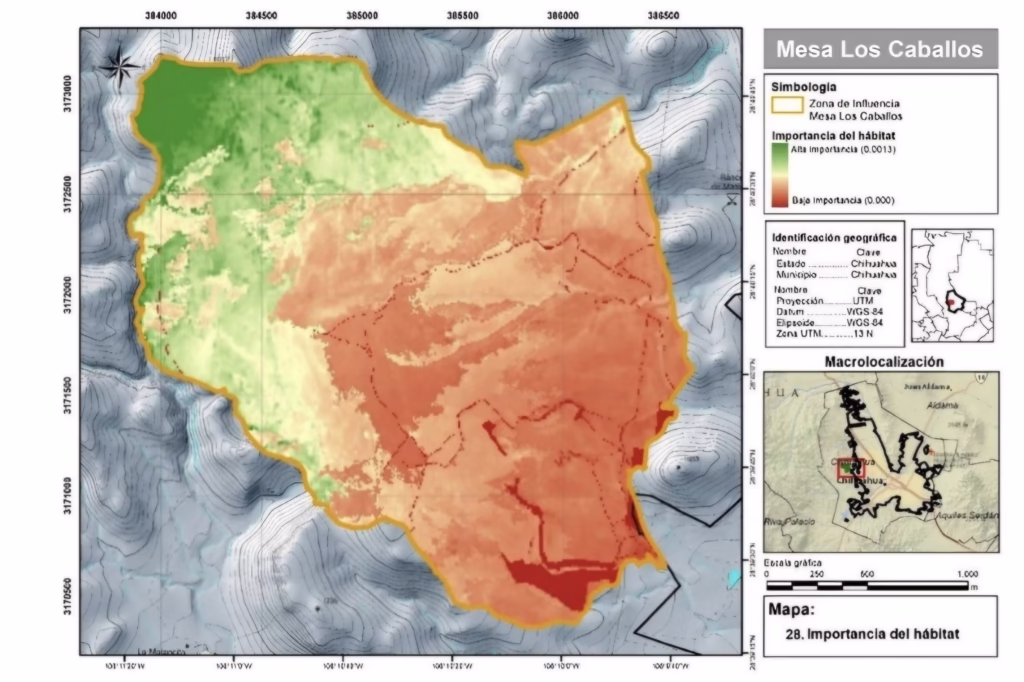 La directora informó que el estudio responde a una solicitud formal del Ayuntamiento derivada de una consulta pública, y que para su elaboración se contrató a especialistas, entre ellos un equipo multidisciplinario de la Universidad Autónoma de Chihuahua (UACH). Agregó que los resultados servirán para generar futuras guías de diseño ambiental y para la siguiente actualización del PDU.El responsable técnico del estudio, el Dr. Jesús Alejandro Pierre, del Centro de Análisis Espacial y Modelación de Ecosistemas, expuso la metodología y los principales resultados. Detalló que el área evaluada comprende 500 hectáreas alrededor de la Mesa de los Caballos, la cual tiene una superficie central de 2.5 hectáreas. El estudio incluyó análisis de la condición actual del sitio, vegetación, unidades ambientales, dinámica climática y calidad del hábitat.