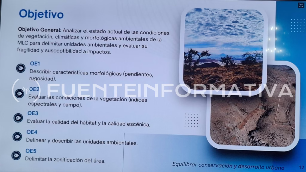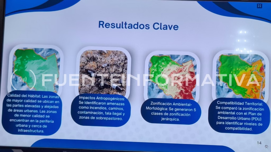 Martínez Ayón explicó que el estudio ratifica en qué zonas podría existir desarrollo urbano -únicamente donde el uso de suelo urbanizable ya está establecido en el PDU- y dónde no es compatible. Señaló que la preservación ecológica no permite actividades urbanizables. Agregó que el Municipio también trabaja en estudios para otras áreas señaladas en el PDU como susceptibles de catalogación ambiental, como el Cerro Coronel, Cerro Grande, Picos de la Luna y el Cañón del Marro.