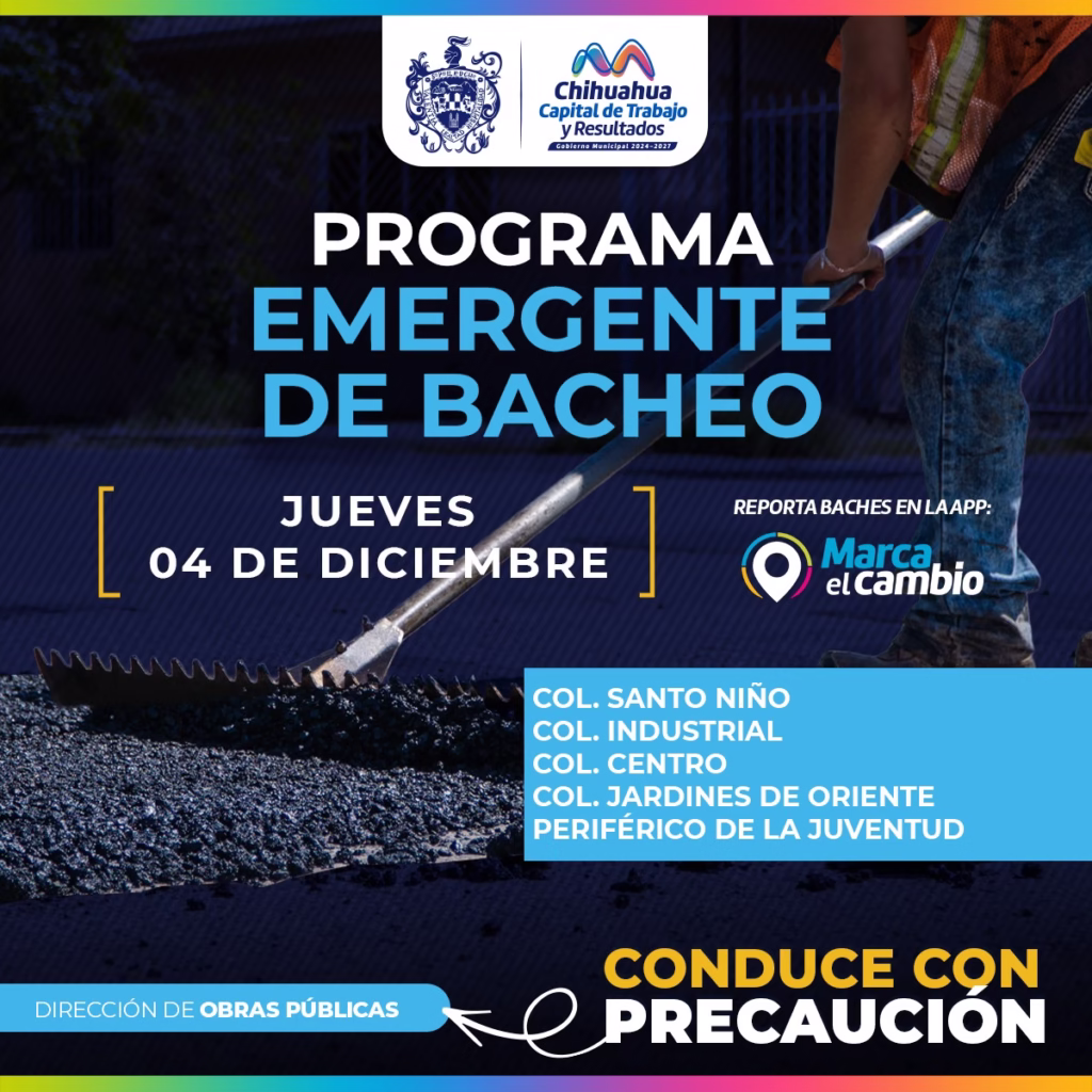 H. Ciudad de Chihuahua, Chih., A 4 de diciembre del 2025.- El Gobierno Municipal, a través de la Dirección de Obras Públicas, realizará trabajos de bacheo este jueves 4 de diciembre, mediante el programa emergente en calles de las colonias: Santo Niño, Industrial, Centro y Jardines de Oriente, así como en el periférico de la Juventud.