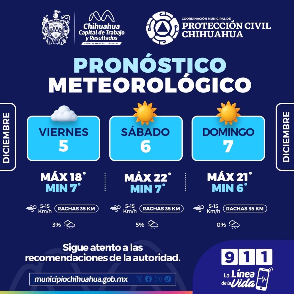 H. Ciudad de Chihuahua, Chih., a 5 de diciembre de 2025.- La Coordinación Municipal de Protección Civil informa que este fin de semana, del 5 al 7 de diciembre, persistirán las temperaturas frías por las mañanas, con máximas moderadas durante el día.