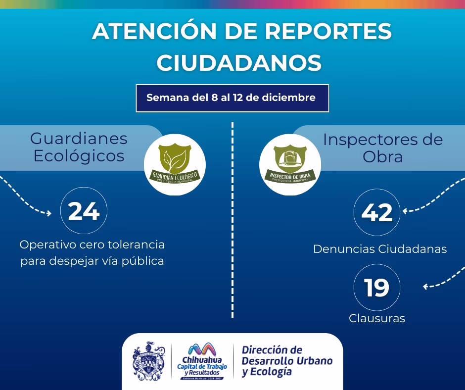 H. Ciudad de Chihuahua, Chih., a 15 de diciembre de 2025.- El Gobierno Municipal de Chihuahua, a través de la Dirección de Desarrollo Urbano y Ecología, informa a la ciudadanía sobre las acciones realizadas del 8 al 12 de diciembre, como parte de los trabajos de vigilancia, ordenamiento urbano y protección del medio ambiente.