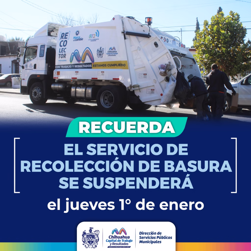 H. Ciudad de Chihuahua, Chih., a 30 de diciembre de 2025.- El Gobierno Municipal, a través de la Dirección de Servicios Públicos Municipales, informa a la ciudadanía que, con motivo de la celebración de Año Nuevo, el próximo jueves 1 de enero, el servicio de recolección de basura se suspenderá.