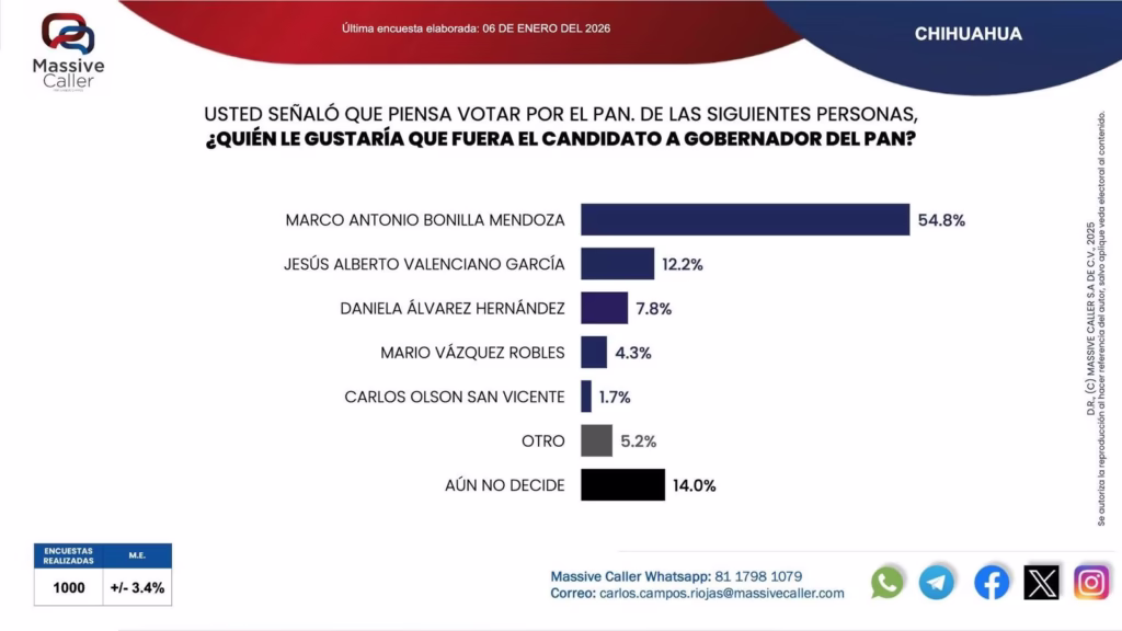 Chihuahua, Chih.– A poco más de un año de la elección por la gubernatura de Chihuahua, el alcalde de la capital, Marco Bonilla, se posiciona como el principal perfil del Partido Acción Nacional rumbo a 2027, al encabezar con amplia ventaja las preferencias internas de su partido, de acuerdo con una encuesta difundida este miércoles 7 de enero por la firma Massive Caller.