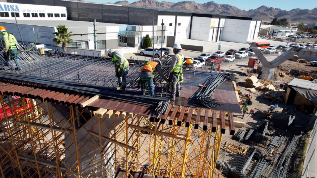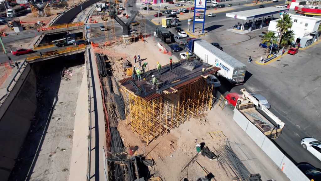 Actualmente, los trabajos se concentran en la conformación de la estructura principal del puente, mediante el colado de columnas, así como en la colocación de elementos prefabricados de concreto que darán forma a las rampas de acceso. De manera paralela, se realizan excavaciones necesarias para el desarrollo de esta etapa constructiva.