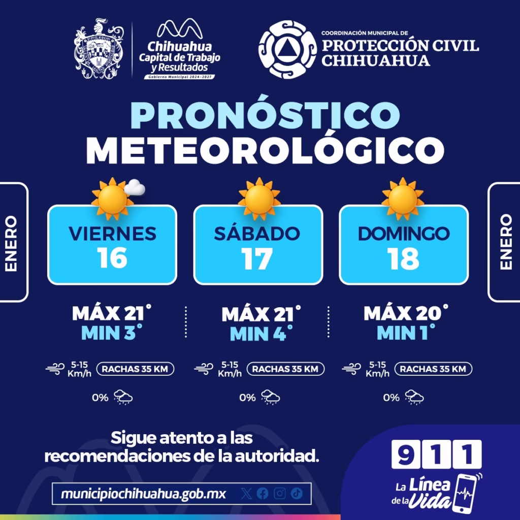 H. Ciudad de Chihuahua, Chih., a 16 de enero 2026.- La Coordinación Municipal de Protección Civil informa que, durante el fin de semana del 16 al 18 de enero, continuarán las bajas temperaturas en la capital por lo que exhortan a continuar con las precauciones adecuadas para evitar enfermedades respiratorias.