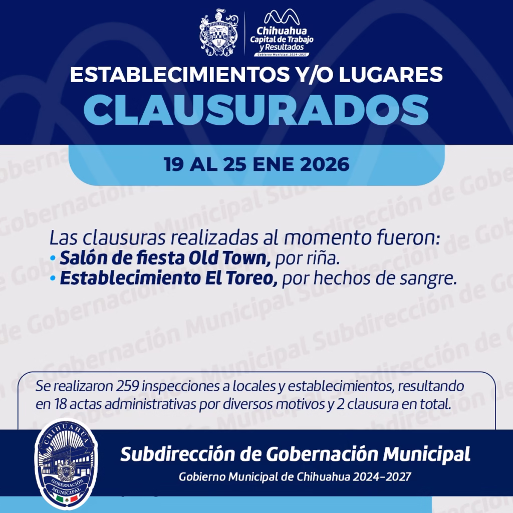 H. Ciudad de Chihuahua, Chih., a 26 de enero del 2025.- El Gobierno Municipal de Chihuahua, a través de la Subdirección de Gobernación de la Secretaría del Ayuntamiento, informa que del 19 al 25 de enero se realizaron 259 inspecciones a locales y establecimientos, resultando en 18 actas administrativas por diversos motivos y dos clausuras en total.