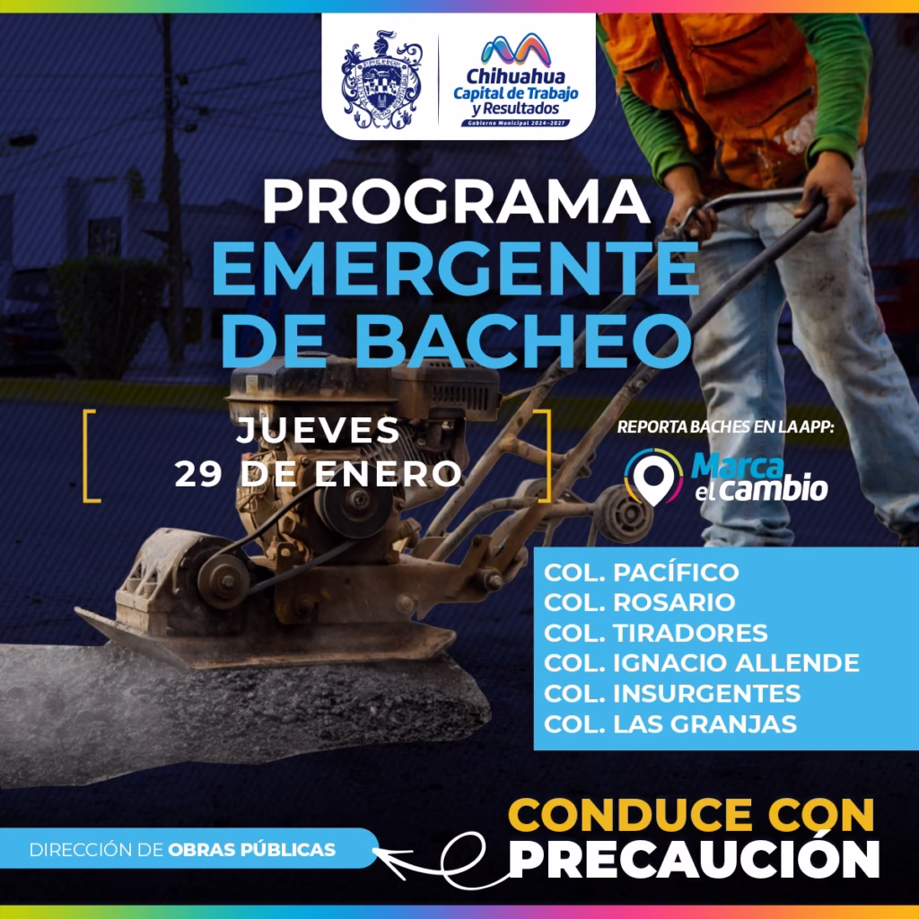 H. Ciudad de Chihuahua, Chih., a 29 de enero del 2026.- El Gobierno Municipal, a través de la Dirección de Obras Públicas, realizará trabajos de bacheo este jueves 29 de enero mediante el programa emergente en calles de las colonias: Pacífico, Rosario, Tiradores, Ignacio Allende, Insurgentes y Las Granjas.Para seguridad de conductores, se exhorta a tomar precauciones, por las labores con múltiples cuadrillas que se realizarán por la mañana.