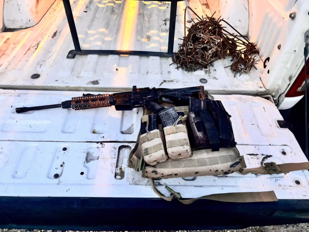 Una vez confirmada la ubicación, los elementos aéreos notificaron a las unidades terrestres, las cuales se aproximaron al sitio para realizar la inspección correspondiente. En el lugar, los agentes localizaron un arma larga de fuego, cuatro cargadores, 75 cartuchos útiles, un chaleco táctico con placas balísticas, así como una cadena de fabricación artesanal con ponchallantas incrustados.