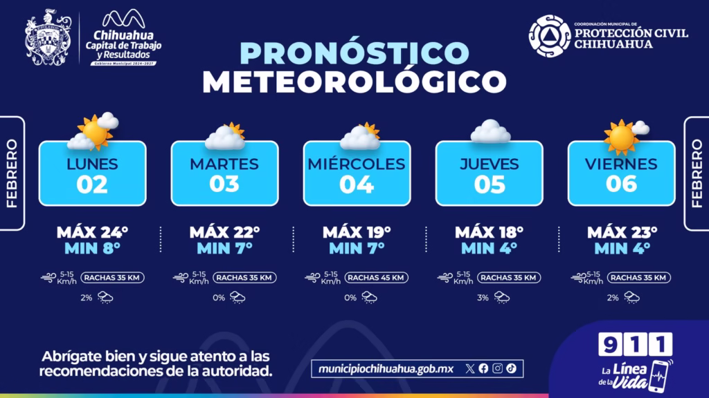 Chihuahua, Chih.– La Coordinación Municipal de Protección Civil informó que durante esta semana se espera un descenso gradual de las temperaturas, mayor presencia de nubosidad a mitad de semana y condiciones climáticas mayormente estables en la capital del estado.