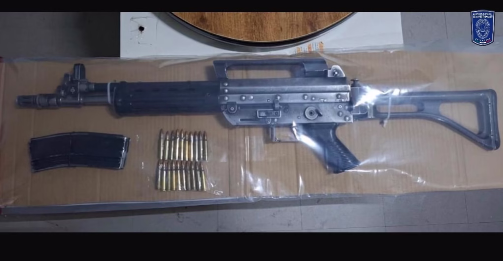 Durante la revisión, los agentes detectaron que el hombre portaba un arma larga con la leyenda Beretta, calibre 5.56 x 45 milímetros, además de cuatro cargadores abastecidos con un total de 100 cartuchos útiles.