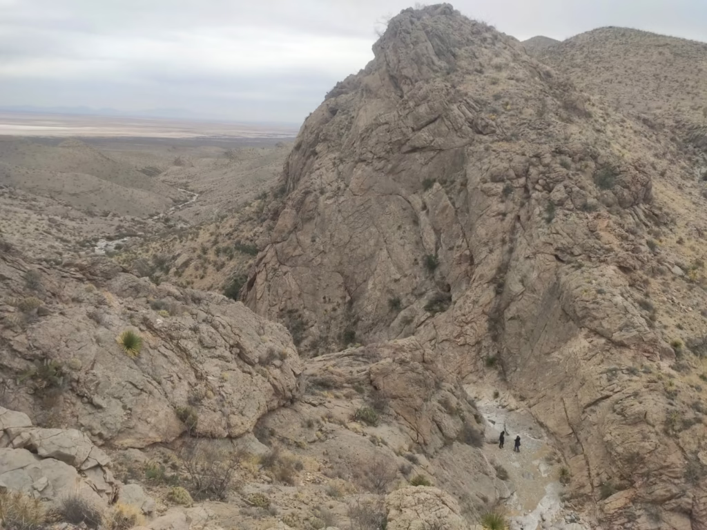 Para llegar al cerro hay que cruzar un gigantesco barreal conocido como la Laguna de Guzmán, uno de los impresionantes remanentes del antiguo Lago Palomas, un cuerpo de agua ancestral que se ha secado casi por completo y que regresa fragmentado cada temporada de lluvias.