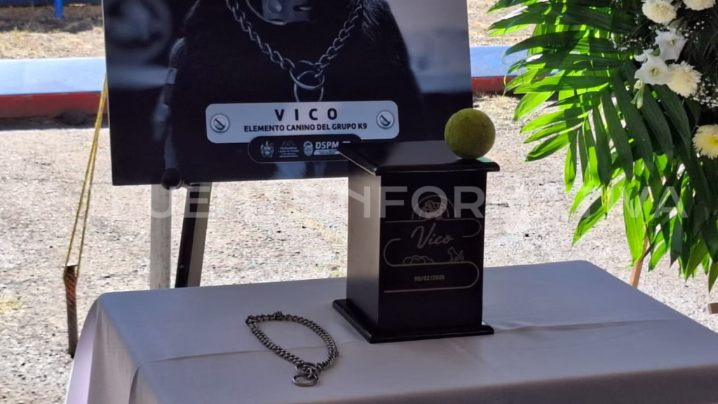 Chihuahua, Chih. a 10 de febrero de 2026 — Este martes autoridades municipales rindieron homenaje a Vico, elemento del grupo K9 quien perdió la vida en cumplimiento de su deber durante la atención de un operativo por disturbios al interior de un hogar.