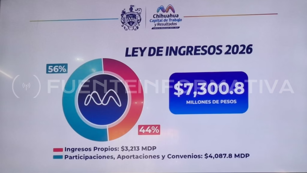 Chihuahua, Chih.- La tesorera municipal, Aída Amanda Córdova, realizó esta mañana una rueda de prensa para informar los objetivos del presente año, en el contexto de la Ley de Ingresos 2026, que asciende a 7, 300.8 millones de pesos.