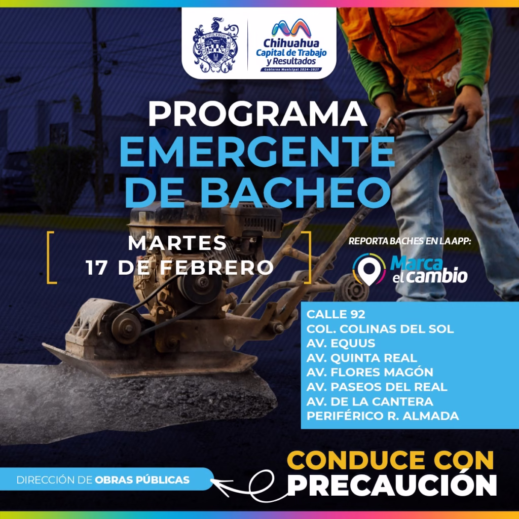 H. Ciudad de Chihuahua, Chih., a 17 de febrero de 2026.- El Gobierno Municipal, a través de la Dirección de Obras Públicas, realizará trabajos de bacheo este martes 17 de febrero mediante el programa emergente en la calle 92, colonia Colinas del Sol, así como las avenidas: Equus, Quinta Real, Flores Magón, Paseos del Real y De la Cantera además del periférico R. Almada.