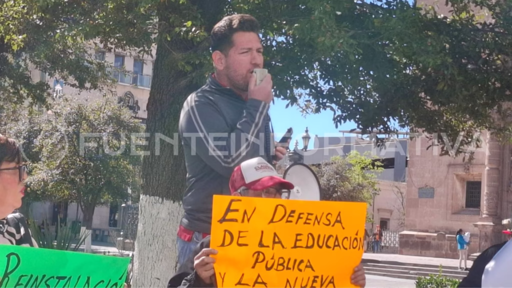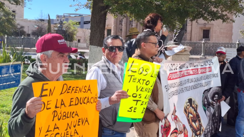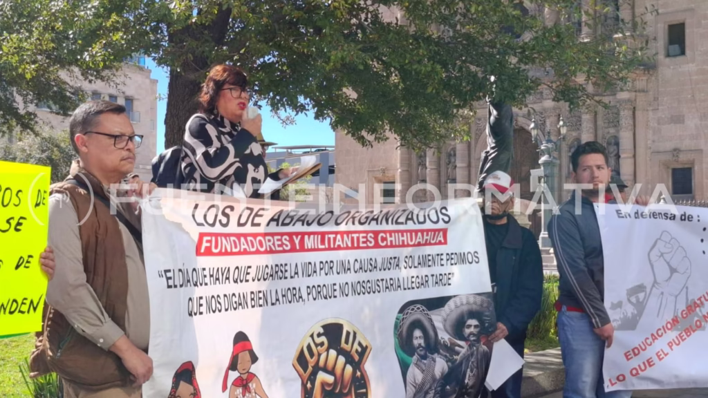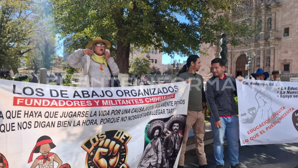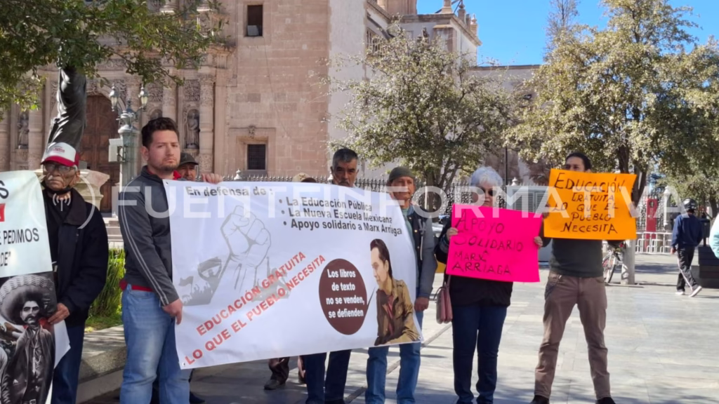 Chihuahua, Chih.- Esta mañana, alrededor de 10 personas se manifestaron en Plaza de Armas, frente al Congreso del Estado, en solidaridad con Marx Arriaga, tras su destitución de la Secretaría de Educación Pública (SEP).