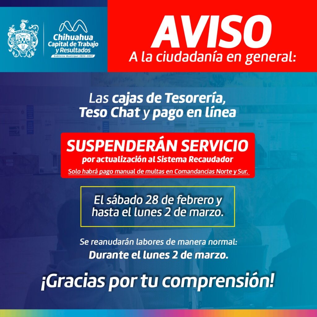 H. Ciudad de Chihuahua, Chih., a 26 de febrero de 2026.- El Gobierno Municipal informa a la población en general que las cajas receptoras de la Tesorería suspenderán su servicio de pagos el sábado 28 de febrero y hasta el lunes 2 de marzo, debido a una actualización que se realizará en el Sistema Recaudador.