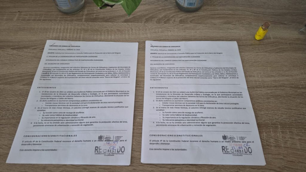 Chihuahua, Chih.– Integrantes del colectivo Salvemos los Cerros de Chihuahua presentaron ante autoridades municipales una solicitud formal para que se convoque a una consulta pública ciudadana con el objetivo de declarar como Área Natural Protegida la Sierra del Mogote, ubicada al poniente de la capital.