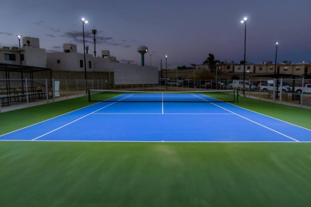 La obra consistió en la cancha de tenis, andadores de arcilla, banquetas, iluminación a luz LED para mejor visibilidad, bancas con malla sombra y gradas con techumbre metálica para protegerse del sol y lluvias.