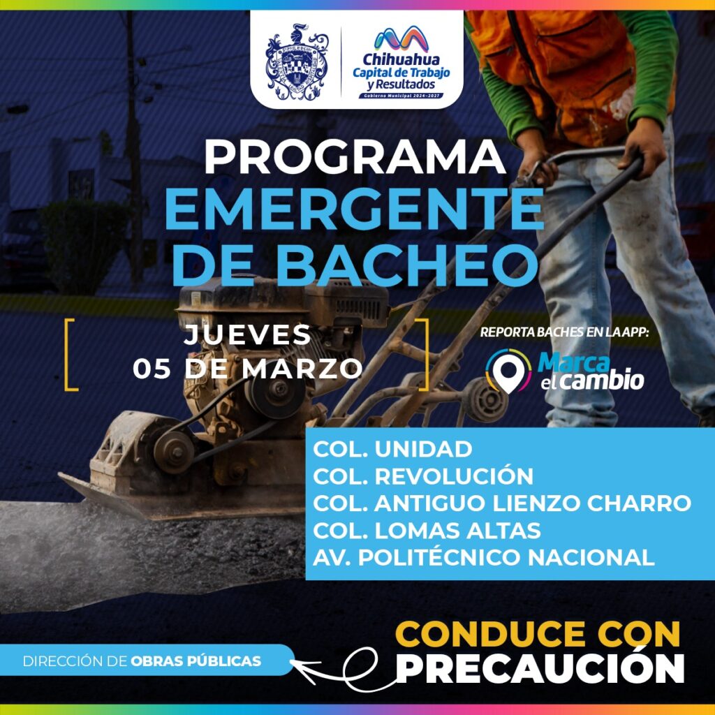 H. Ciudad de Chihuahua, Chih., a 5 de marzo de 2026.- El Gobierno Municipal, a través de la Dirección de Obras Públicas, realizará trabajos de bacheo este jueves 5 de marzo mediante el programa emergente en las calles de las colonias: Unidad, Revolución, Antiguo Lienzo Charro y Lomas Altas, así como en la avenida Politécnico Nacional.