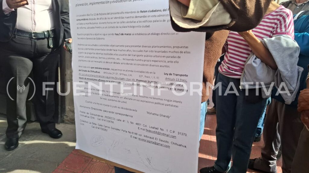 En el escrito, Retén Ciudadano solicita que se respete el derecho de petición establecido en el artículo 8 de la Constitución, asi como disposiciones de la Ley Estatal de Transporte de Chihuahua, entre ellas el artículo 13, fracción 15, que establece la promoción de la participación ciudadana en la planeación, implementación y evaluación de politicas públicas en materia de transporte.