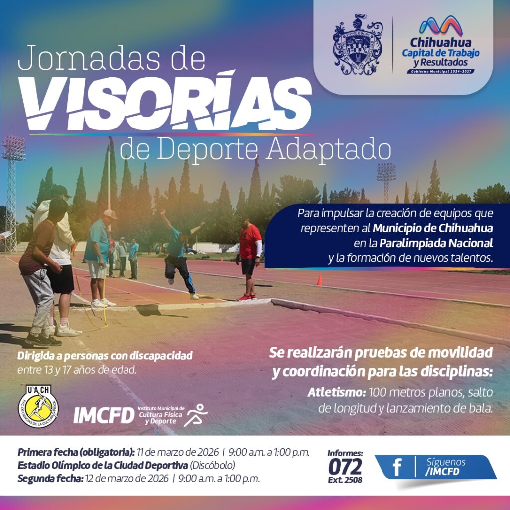H. Ciudad de Chihuahua, Chih., a 6 de marzo de 2026.- Con el compromiso brindar la accesibilidad de todas las personas en la iniciación del deporte, el Gobierno Municipal de Chihuahua, a través del Instituto Municipal de Cultura Física y Deporte (IMCFyD), convoca a personas con discapacidad a participar en las visorías deportivas.