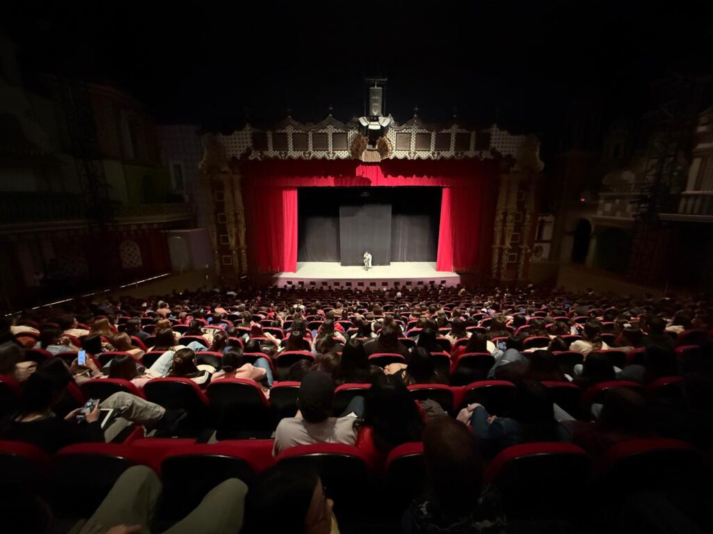 Uno de los momentos más celebrados ocurrió cuando los actores bajaron del escenario para recorrer las filas del teatro en una divertida persecución que sorprendió a los asistentes y convirtió la obra en una experiencia aún más cercana e inmersiva.