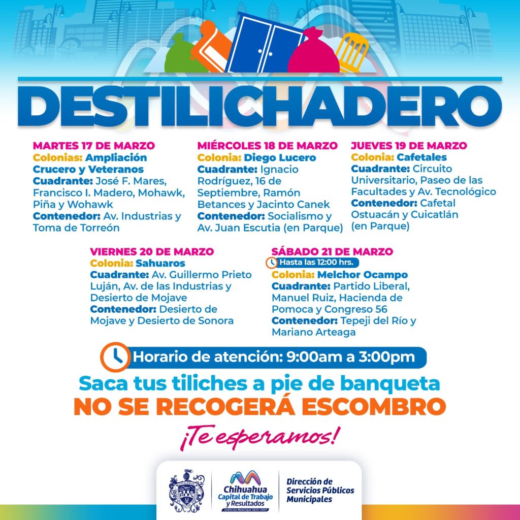 H. Ciudad de Chihuahua, Chih., a 14 de marzo de 2026.- Para evitar acumulaciones de basura de grandes dimensiones en las viviendas, que podría generar plagas o problemas de salud, el Gobierno Municipal, a través de la Dirección de Servicios Públicos Municipales, informa el calendario del programa Destilichadero, que se realizará en seis colonias de la capital del 17 al 21 de marzo.